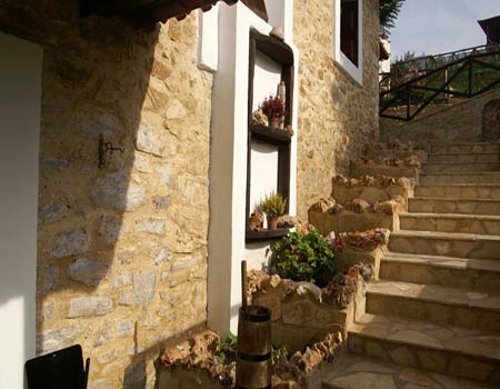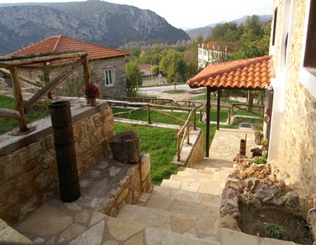 Η πετρόχτιστη αυλή διαμορφώθηκε σε πολλαπλά επίπεδα γεμάτη από έλατα, ερυθρελάτη, φλαμουριά καρυδιά και άλλα είδη της τοπικής χλωρίδας. Εδώ μπορείτε να απολάυσετε με ηρεμία το πρωινό σας ή τον καφέ σας καθώς αγναντεύετε την μοναδική θέα στο ποταμό Νέστο και τον Παραδοσιακό Οικισμό της Σταυρούπολης. Το σούρουπο η ατμόσφαιρα γίνετε ακόμα πιο όμορφη με την θέα του φωτισμένου βράχου του ποταμού.